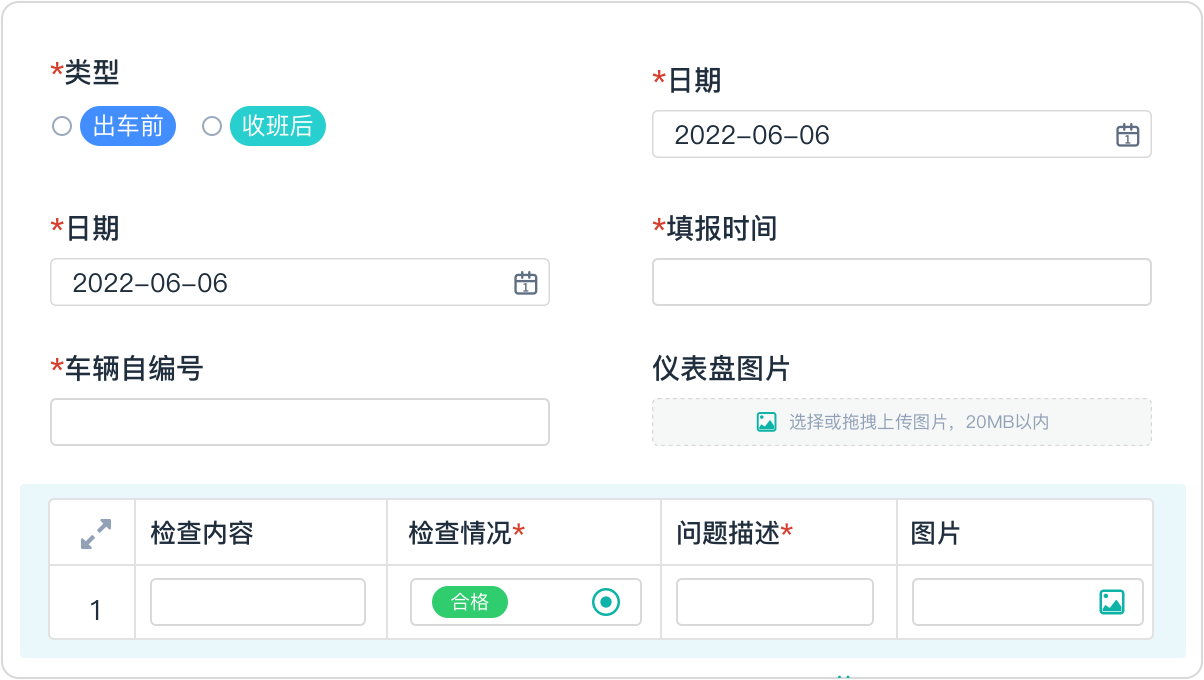 方案:通过驾驶员车辆例保检查单应用,监视员在检查车辆状况时就可在线快速填填报