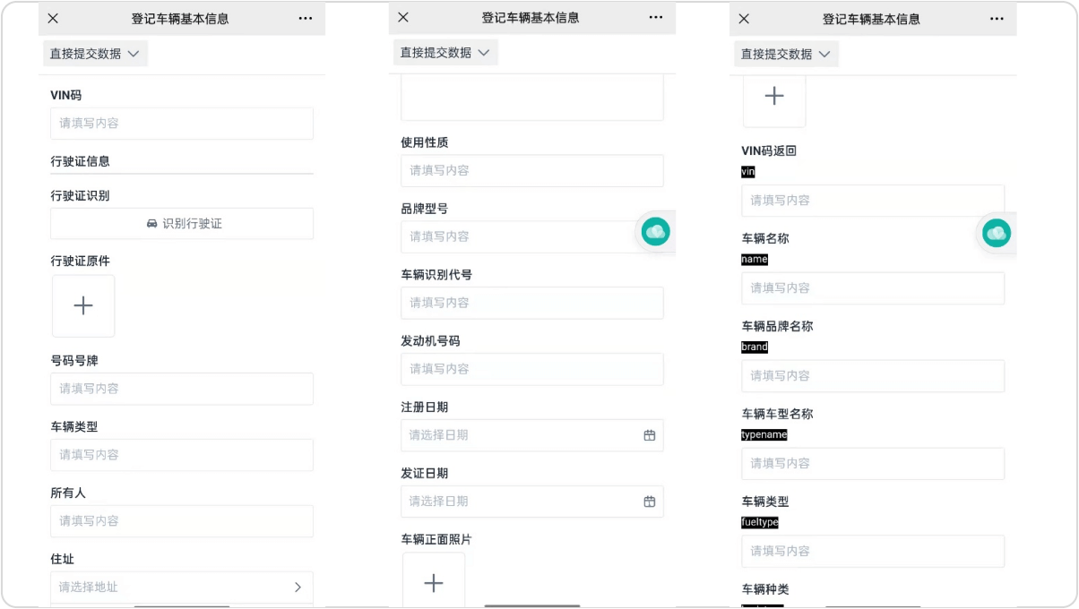 方案:一车一码,车辆信息扫一扫即可录入相应表单,车辆信息 通过文字识别完成基础车辆信息登记后,后续表单以调用为主